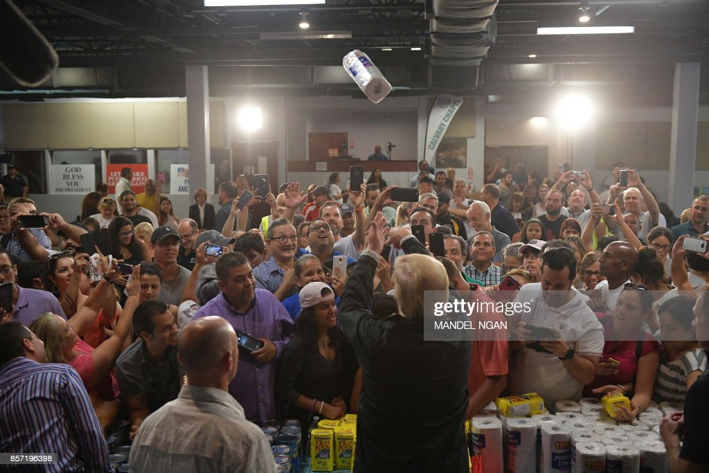 When Hurricane Maria hit the island on October 3, 2017, Trump visited and thew out paper towels to after being criticized for the government’s inadequate response. Trump threw out paper towel rolls as he visited the Cavalry Chapel in Guaynabo, Puerto Rico on October 3, 2017 as much of the island remained then short of food and without access to power or drinking water.