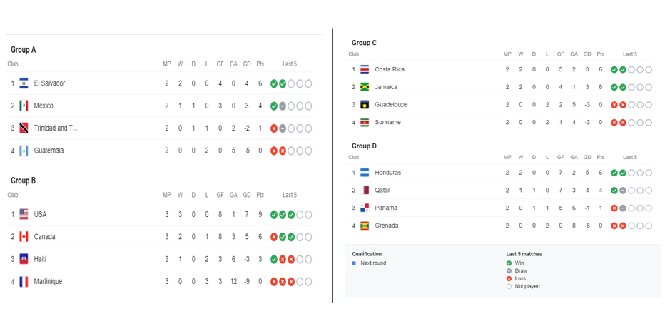 News Americas, KANSAS CITY, Kansas, Fri. July 16, 2021: Which team will advance to the quarterfinals of the 2021 CONCACAF Gold Cup on July 24th and 25th? That’s the million-dollar question as soccer teams from Groups A-D continue to slug it out for the coveted slots and bragging rights. Here’s where the points table stands currently: