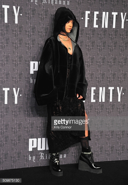 The trend continued with Rihanna covered from head to toe as she attended the FENTY x PUMA by Rihanna fashion week launch at 23 Wall Street on February 12, 2016 in New York City. That trend continued into the fashion show and even at the Brit Award in Feb. and at the 2016 MusiCares Person of the Year honoring Lionel Richie on February 13, 2016 where the Bad Girl only tastefully flashed some leg and cleavage. (Photo by Kris Connor/WireImage)
