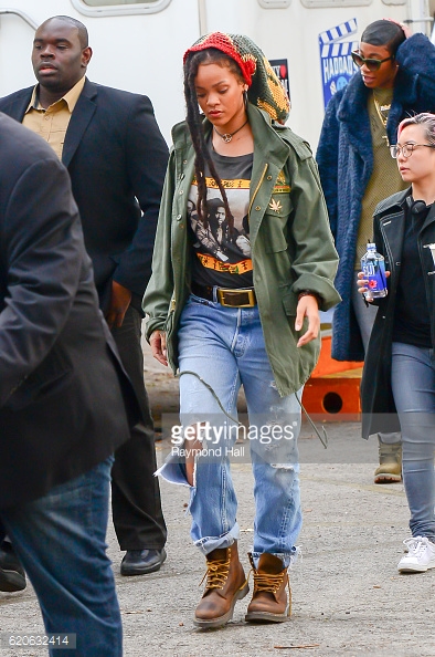 Rihanna, sporting locks in October, was almost unrecognizable and could have been another island Rasta girl as she was seen here entering an office building in Manhattan on October 05, 2016 in New York, New York. She carried the look into her night out and into the lead up to the 2016 US election where she kept her locks but sported a Hillary Clinton supporter t-shirt in Manhattan on October 19, 2016 in New York City. (Photo by Josiah Kamau/BuzzFoto via Getty Images)