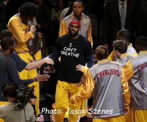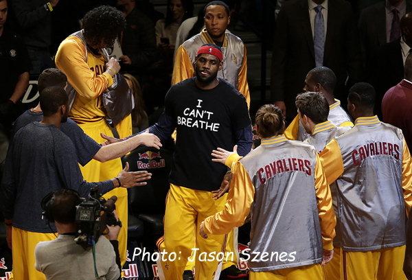 ‘King’ LeBron James warmed up in an ‘I Cant Breathe’ T-shirt before the game. (Jason Szenes image)