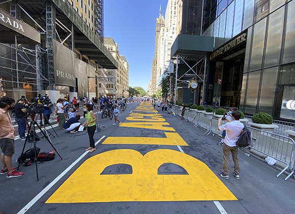 As a hot sun beat down on hundreds of gallons of paint drying outside one of Manhattan’s most prestigious addresses, de Blasio’s office tweeted a photograph of the mural with the words, “NYC has a message for the world: #BlackLivesMatter.”