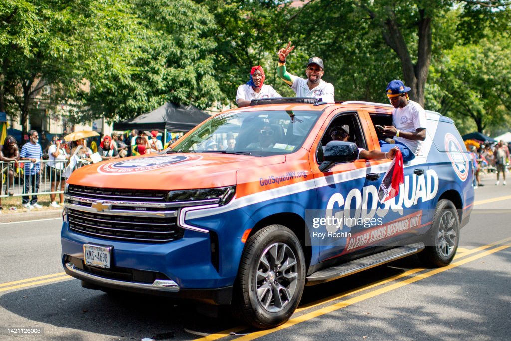 Members of Godsquad “Clergy Crisis Responce Unit” with marchers as they participate in the annual West Indian Day parade on September 5, 2022 in the Brooklyn Borough of New York City. (Photo by Roy Rochlin/Getty Images)