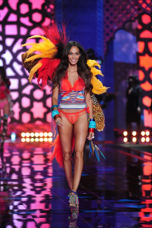 Both Lima and Ambrosio made a stunning double entrance in this year’s Fantasy Bras while Joan Smalls Rodriguez, a Puerto Rican fashion model, who in 2011 became the first Latina model to represent Estée Lauder cosmetics, also rocked the cat walk with a sexy red and multi-colored feathered number.