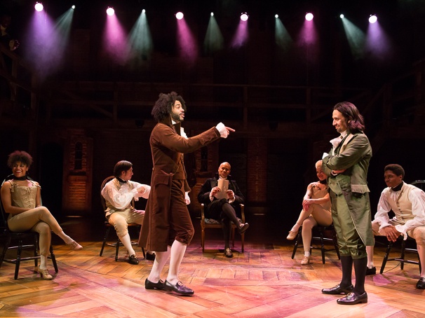The two-hour-and-45-minute show is directed by Thomas Kail, inspired by the book Alexander Hamilton by Ron Chernow and features book, music, and lyrics also by Lin-Manuel Miranda. The show intertwines the musical genres of rap and R&B ballads with traditional musical-theater melodies to portray Hamilton as a striving immigrant.