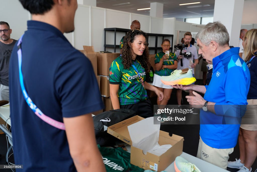 IOC President Thomas Bach speaks with swimmer Jasmine Schofield from Dominica while touring the athletes village ahead of the start of the Paris 2024 Olympic Games on July 22, 2024 in Paris, France. (Photo by David Goldman - Pool/Getty Images)
