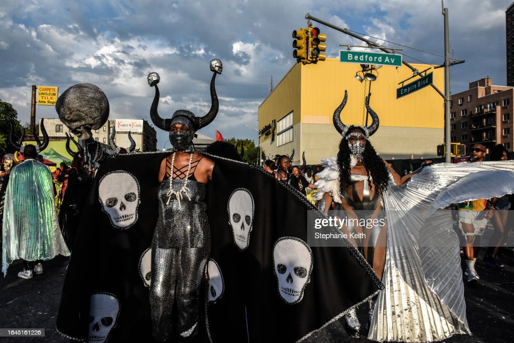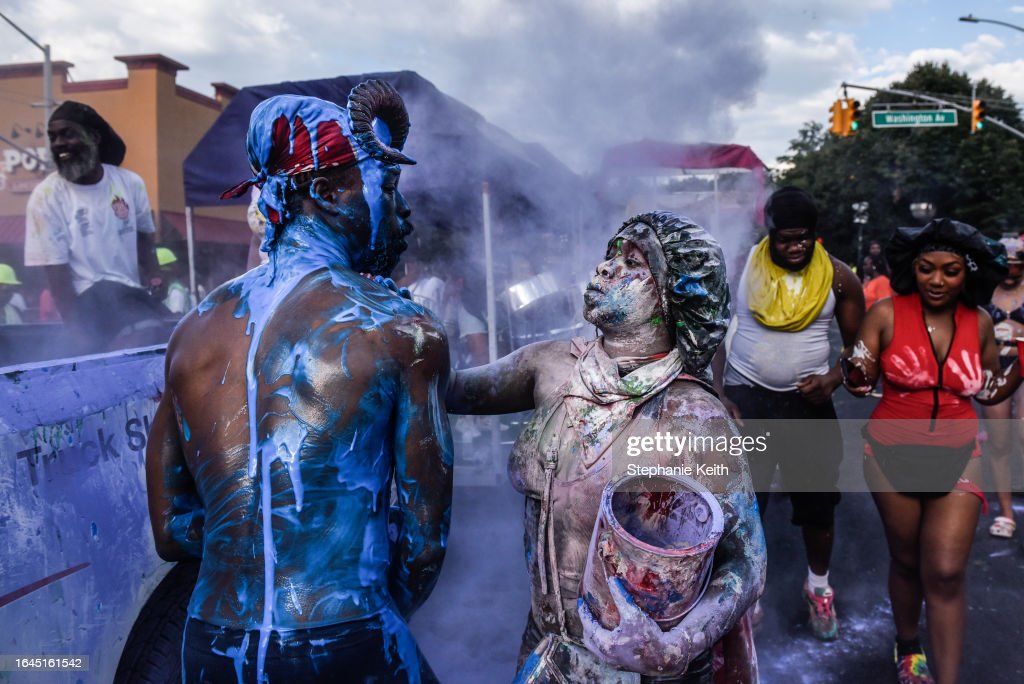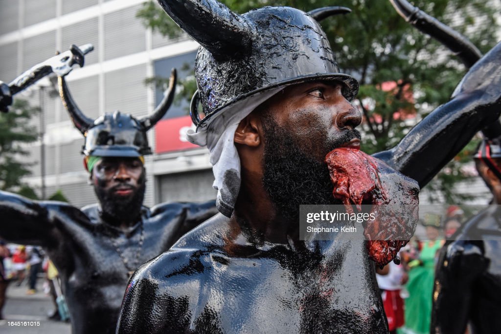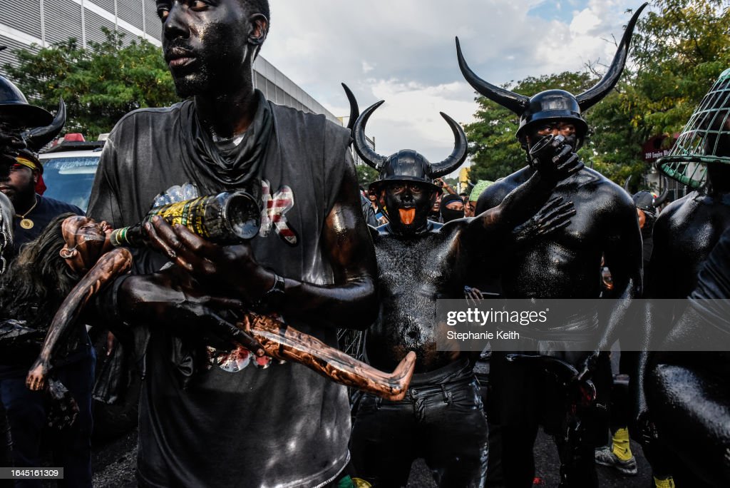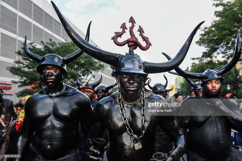 People wear horns to embody a character called “Jab Jab” (from the French for Devil) in a Caribbean street carnival starting at dawn called J’Ouvert on September 4, 2023 in the Brooklyn borough in New York City. (Photo by Stephanie Keith/Getty Images) (Photo by Stephanie Keith/Getty Images) (Photo by Stephanie Keith/Getty Images) (Photo by Andrew Lichtenstein/Corbis via Getty Images) (Photo by Stephanie Keith/Getty Images)People cover themselves with paint and powder called “playing mas” during a Caribbean street carnival starting at dawn called J’Ouvert on September 4, 2023 in the Brooklyn borough in New York City. (Photo by Stephanie Keith/Getty Images) (Photo by Stephanie Keith/Getty Images) (Photo by Stephanie Keith/Getty Images)(Photo by Andrew Lichtenstein/Corbis via Getty Images)