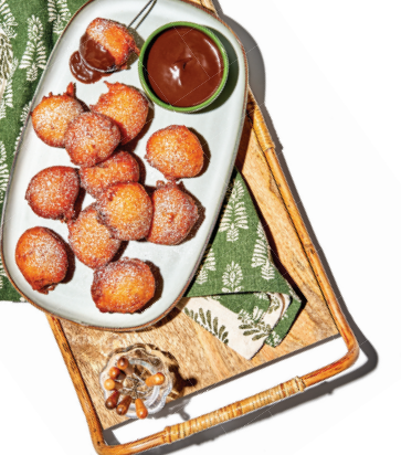 6. Drain fritters on a paper towel and serve with chocolate rum sauce (drizzle or dip).