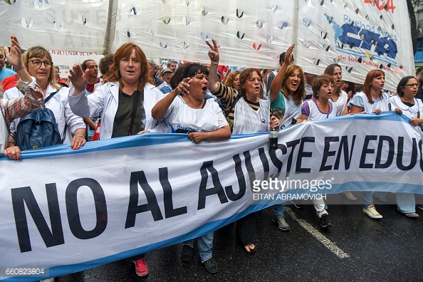 Teachers march toward the Plaza de Mayo square during a demonstration called by the Argentine Central Workers (CTA) union against President Mauricio Macri and his government’s economic measures, in Buenos Aires on March 30, 2017. / AFP PHOTO / EITAN ABRAMOVICH (Photo credit: EITAN ABRAMOVICH/AFP/Getty Images)