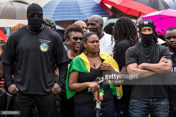 Members of the collective ‘500 freres’ stand in front of a crowd gathered outside the prefecture in Cayenne on March 30, 2017, in support of the collective ahead of negotiations with the French overseas and interior ministers. Life in French Guiana has been disrupted for over ten days, the conflict starting with a general strike that closed schools and shops and stoked fears of further instability in one of France’s overseas territories. Negotiations between the ministers and the collective were stopped less than a half hour after they began. (Photo credit: JODY AMIET/AFP/Getty Images)