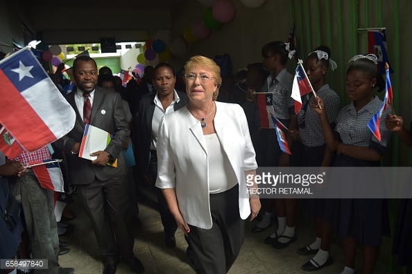 Chilean President Michelle Bachelet attends the inauguration of the Republic of Chile School in Port-au-Prince, on March 27, 2017. The old school was destroyed by the earthquake that hit Haiti in January 2010. Michelle Bachelet is making a state visit to Haiti. (Photo credit: HECTOR RETAMAL/AFP/Getty Images)