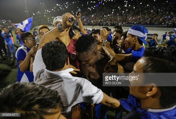 Nicaraguan player Fernando Copete (C) celebrates with fans after his team qualified for the 2017 Gold Cup at the National Stadium, in Managua, on March 28, 2017. The Gold Cup will take place in July in the United States. (Photo credit: INTI OCON/AFP/Getty Images)