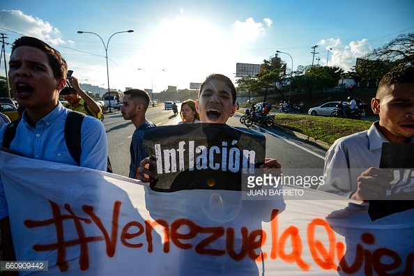 Students take part in a protest against Venezuelan President Nicola Maduro on the main highway in Caracas on March 30, 2017. Venezuela’s Supreme Court took over legislative powers Wednesday from the opposition-majority National Assembly, whose speaker accused leftist President Nicolas Maduro of staging a ‘coup.’ (Photo credit: JUAN BARRETO/AFP/Getty Images)