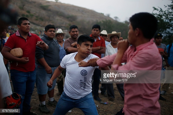 Young men battle during The Tigers’ Fight, at the ecological reserve of Kumulian on May 03, 2017 in Acatlan, Mexico. Every year hundreds of people gather in the tigers’ fight celebration, as a ritual to have good harvests and many rains in their fields, offering their sweat and blood during boxing battles. (Photo by Miguel Tovar/LatinContent/Getty Images)