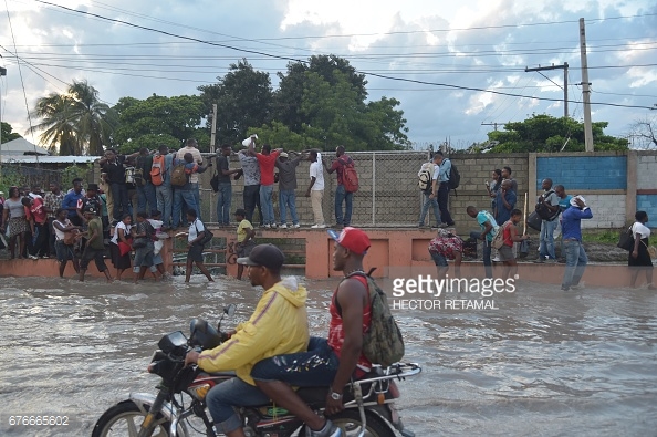 A group of people walk in a partially flooded street by the rains, while others try to walk over the water, holding themselves in a grating, in the Haitian capital Port-au-Prince, on May 2, 2017. (Photo credit: HECTOR RETAMAL/AFP/Getty Images)
