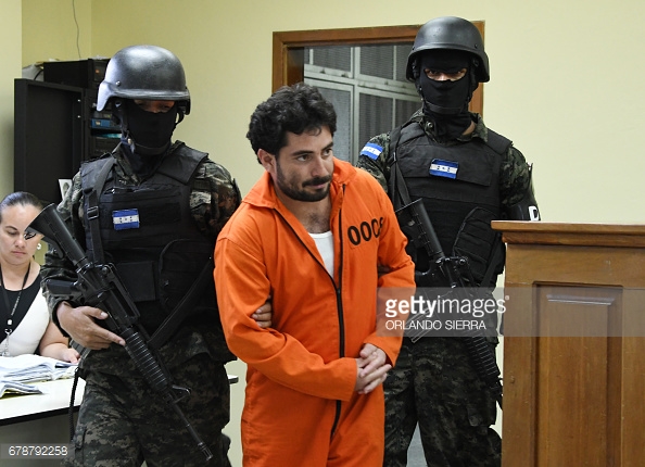 Militarized policemen escort Plutarco Ruiz after he was found guilty of the murder of his girlfriend Sofia Trinidad Alvarado and her sister, the late former Miss Honduras Mundo, Maria Jose Alvarado, in Tegucigalpa on May 4, 2017. According to the Honduran Penal Code, Plutarco could be sentenced to 70 years in prison. (Photo credit: ORLANDO SIERRA/AFP/Getty Images)