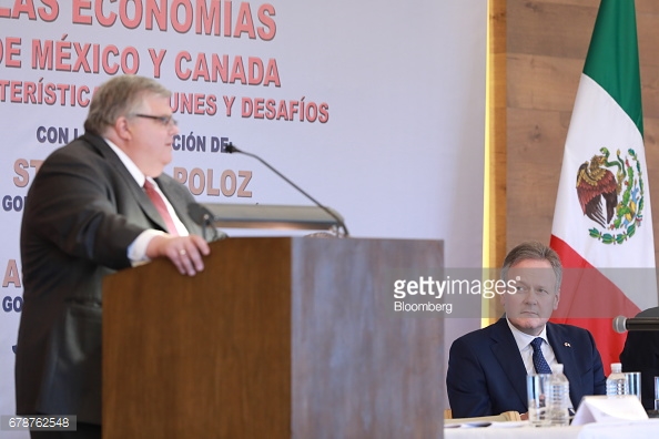 Stephen Poloz, governor of the Bank of Canada, listens as Agustin Carstens, governor of Banco de Mexico (Banxico), left, speaks during an event at the Chamber of Commerce of Canada (CanCham) in Mexico City, Mexico, on Thursday, May 4, 2017. Poloz said Canadian businesses are worried over everything from U.S. tax policy to trade protection, making them less likely to invest — a problem that Mexico also faces.( Photographer: Susana Gonzalez/Bloomberg via Getty Images)
