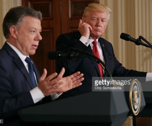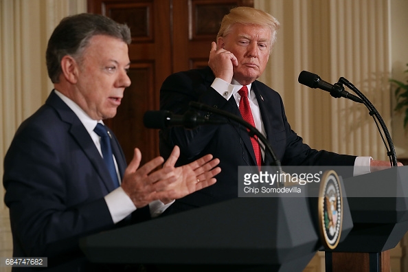Colombian President Juan Manuel Santos (L) and U.S. President Donald Trump hold a joint news conference at the White House May 18, 2017 in Washington, DC. The Trump administration has said it wants to slash foreign aide and Santos will most likely seek a renewal of $450 million dollars from the U.S. that supports the peace accord between the Columbian government at the Revolutionary Armed Forces (FARC). (Photo by Chip Somodevilla/Getty Images)