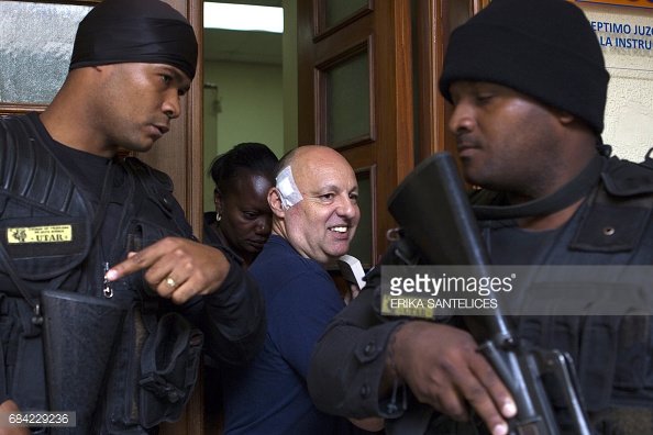 French criminologist Christophe Naudin leaves under custody the court in Santo Domingo, on May 17, 2017. Naudin is being tried for his presumed participation in the evasion of two French pilots condemned to 20 years for drug trafficking in the sounded ‘air cocaine’ case. Judge Kenya Romero set a hearing for next May 25. (Photo credit: ERIKA SANTELICES/AFP/Getty Images)