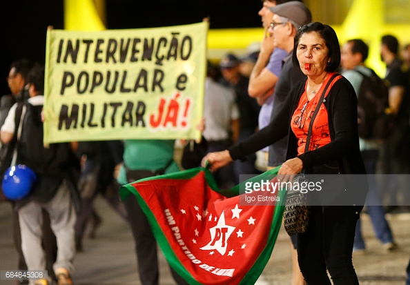 Protests erupt after embattled President Temer refuses to resign on May 18, 2017 in Brasilia, Brazil. A recording of Temer was released in which he allegedly condones bribery payments to Eduardo Cunha, the former President of the Chamber of Deputies. Cunha was involved in the ‘Lava Jato’ (Car Wash) corruption scandal and sentenced to 15 years in prison after being found guilty of corruption, money laundering and illegal money transfers abroad. With the release of the recording, the opposition has called for Temer’s impeachment and new elections. (Photo by Igo Estrela/Getty Images)