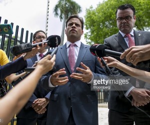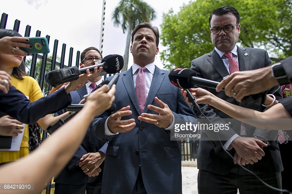 Elias Sanchez, Governor Ricardo Rossello’s representative on the federal board, speaks to members of the media outside the Federal Courthouse in San Juan, Puerto Rico, on Wednesday, May 17, 2017. 16 May 2017. Puerto Rico’s $123 billion bankruptcy case opens Wednesday in a San Juan courtroom, with protesters expected outside, three lawyer-packed courtrooms inside and a request from the judge to leave the cologne at home. (Photographer: Xavier Garcia/ Bloomberg)