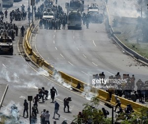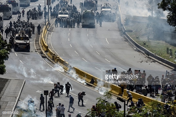 Venezuelan opposition activists clash with the Bolivarian National Guard during protest against government of President Nicolas Maduro, in Caracas, on May 18, 2017. On Monday Venezuelans launched a seventh week of anti-government demonstrations by blocking roads, vowing not to budge all day in protest at a deadly political and economic crisis. (Photo by Carlos Becerra/Anadolu Agency/Getty Images)