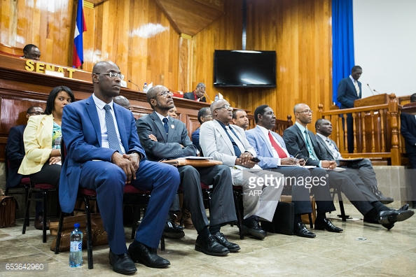 Membres of the new government appointed by Prime minister, Jack Guy Lafontant sit during a parliamentary session to confirm them in Port-au-Prince on March 15, 2017. The Haitian premier has chosen mostly political novices for the country’s new government, nearly three weeks after President Jovenel Moise appointed him to the post.Jack Guy Lafontant, a doctor who like Moise is new to the political scene, signed a decree Monday nominating of his 18 ministers, five of whom are women. / AFP PHOTO / Valerie Baeriswyl (Photo credit: VALERIE BAERISWYL/AFP/Getty Images)