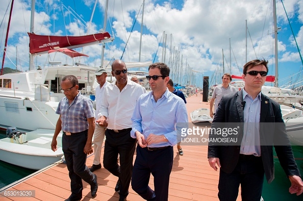 French presidential election candidate for the left-wing Socialist Party (PS) Benoit Hamon (C) speaks to National Assembly member Serge Letchimy (C-L) at a dry dock in Le Marin on March 13, 2017, during a trip to the French overseas territory of Martinique. (Photo credit: LIONEL CHAMOISEAU/AFP/Getty Images)