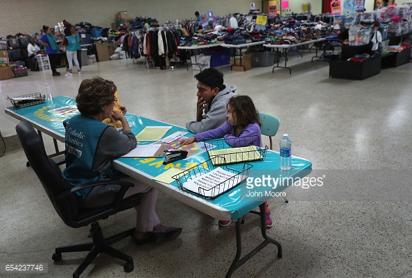 A Catholic Charities volunteer at the Immigrant Respite Center councils a father and daughter from El Salvador on March 16, 2017 in McAllen, Texas. The center, located in McAllen’s Sacred Heart Catholic Church recieved only 2 new arrivals during the day, a huge drop from last year, when sometimes hundreds of immigrants arrived daily. The father, a 29-year-old taxi driver from San Miguel, El Salvador, said that fewer undocumented immigrants are coming to the United States since Donald Trump became President because they fear they will be deported. He said he left his country to seek asylum and live with relatives in Indiana because the Salvadorian gang MS-13 demanded he pay $20 per week in extortion fees, or die. (Photo by John Moore/Getty Images)