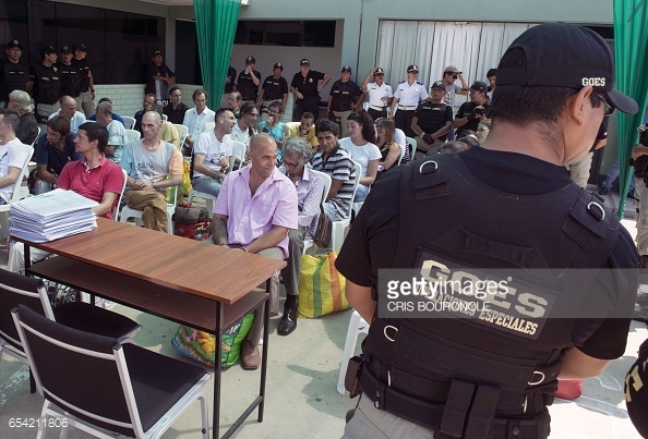 Spanish nationals, held as inmates in different penal institutions of Peru, await transportation to the airport at a police facility in Callao, outskirts of Lima on March 16, 2017. More than thirty Spanish inmates serving their sentence in Peru, seek protection on the grounds of a bilateral agreement between both nations to continue their prison time at home. / AFP PHOTO / CRIS BOURONCLE (Photo credit should read CRIS BOURONCLE/AFP/Getty Images)