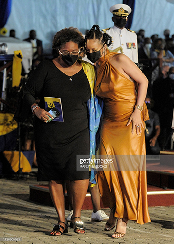 Barbados’s Prime Minister Mia Mottley (L) and Barbadian singer Rihanna (R) attend a ceremony to declare Barbados a republic and the inauguration of the country’s first president, at Heroes Square in Bridgetown on November 30, 2021. (Photo by RANDY BROOKS/AFP via Getty Images)
