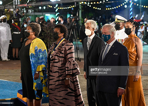 Rihanna (C) is honored as the newest national hero of Barbados at the Presidential Inauguration Ceremony at Heroes Square on November 30, 2021 in Bridgetown, Barbados. T(Photo by Jonathan Brady – Pool/Getty Images)Prime Minister Mia Amor Mottley (L), President of Barbados Dame Sandra Mason (2nd L), National Hero Sir Garfield Sobers (C), Charles, Prince of Wales (3rd R) and Rihanna (R) look on during the Three Cheers to Barbados at the ceremony to declare Barbados a Republic and the Inauguration of the President of Barbados at Heroes Square in Bridgetown, Barbados, on November 30, 2021. (Photo by RANDY BROOKS/AFP via Getty Images)