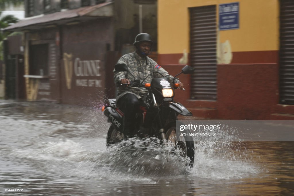People walk through a street flooded due to heavy rains before the arrival of Hurricane Lisa in Belize City on November 2,2022. (Photo by JOHAN ORDONEZ/AFP via Getty Images)