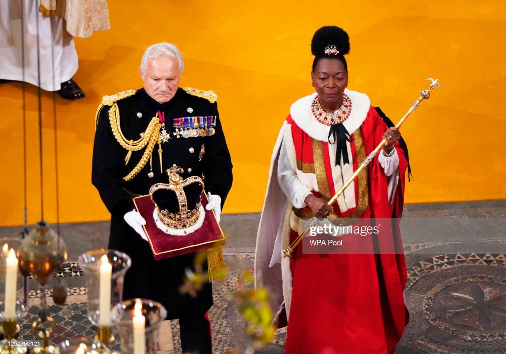 Baroness Floella Benjamin who was born in Trinidad and Tobago and is a former children’s television host turned author and peer, wielded King Charles’s scepter, also referred to as the Rod of Equity and Mercy, which symbolizes his spiritual function.