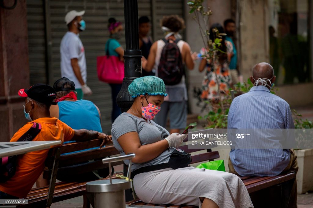 This woman in the DR also wears a brightly colored face mask and a shower cap as a preventive measure against the spread of the new coronavirus, COVID-19, while sitting in a street of Santo Domingo on March 30, 2020. (Photo by ERIKA SANTELICES/afp/AFP via Getty Images)