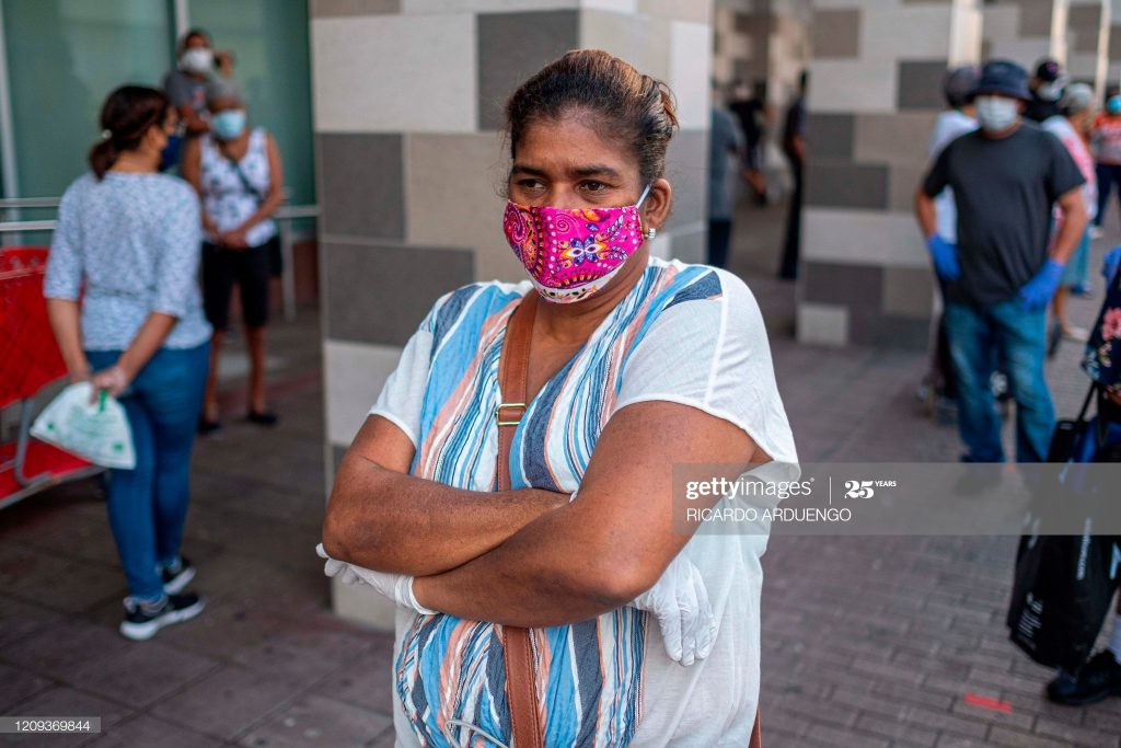 A woman wears a protective face mask as others line up to enter a supermarket keeping social distancing, following the government's measures to help stop the spread of the coronavirus in San Juan, Puerto Rico on April 7, 2020. - On March 15, 2020, Puerto Rico Governor Wanda Vazquez Garced imposed a curfew shuttering non-essential businesses on the island and ordered people to stay home from 7 p.m. to 5 a.m. In addition, from March 31, she imposed even tighter measures, including requiring anyone entering a business to wear a face mask. (Photo by Ricardo ARDUENGO / AFP) (Photo by RICARDO ARDUENGO/AFP via Getty Images)