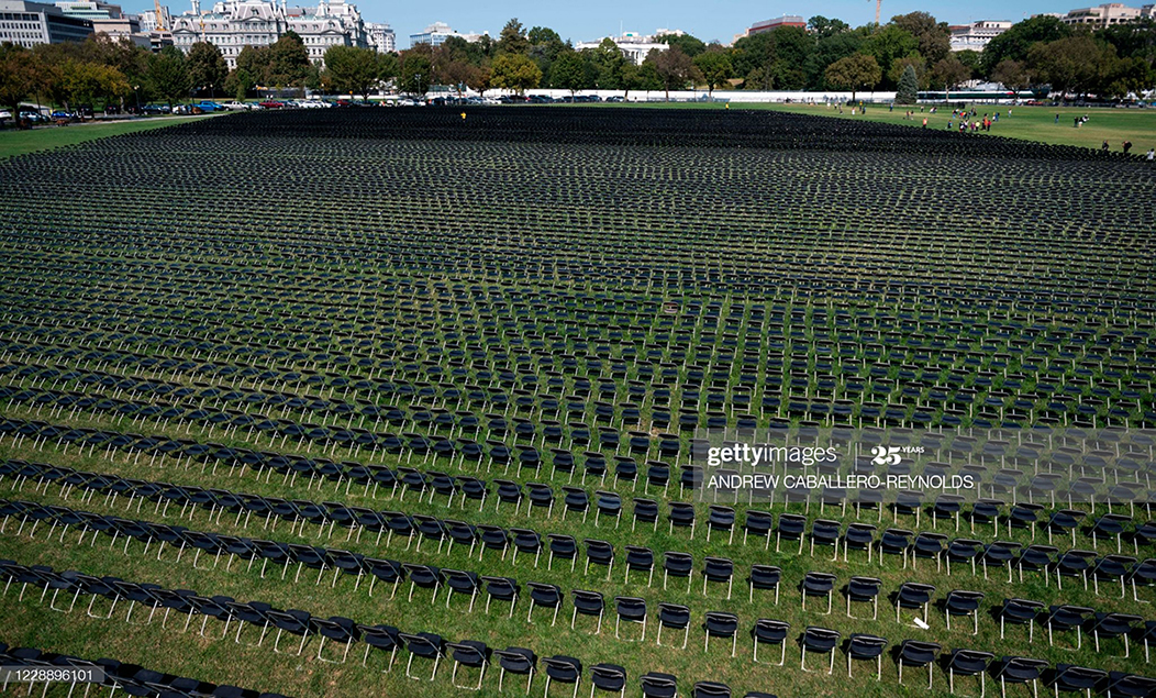 The US’ death toll sot past 214,000 Sunday and its infection rate is now 7,636,912. Empty chairs were put on display to represent the 200,000 plus lives lost due to COVID-19 at the National Covid-19 Remembrance on the ellipse behind the White House in Washington, DC on October 4, 2020.