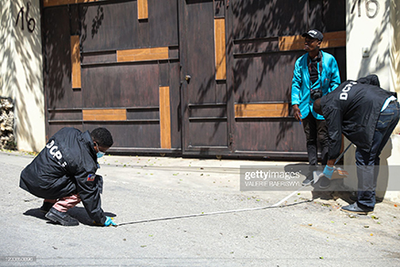 Members of the Haitian police and forensics look for evidence outside of the presidential residence on July 7, 2021 in Port-au-Prince, Haiti. (Photo by VALERIE BAERISWYL/AFP via Getty Images)
