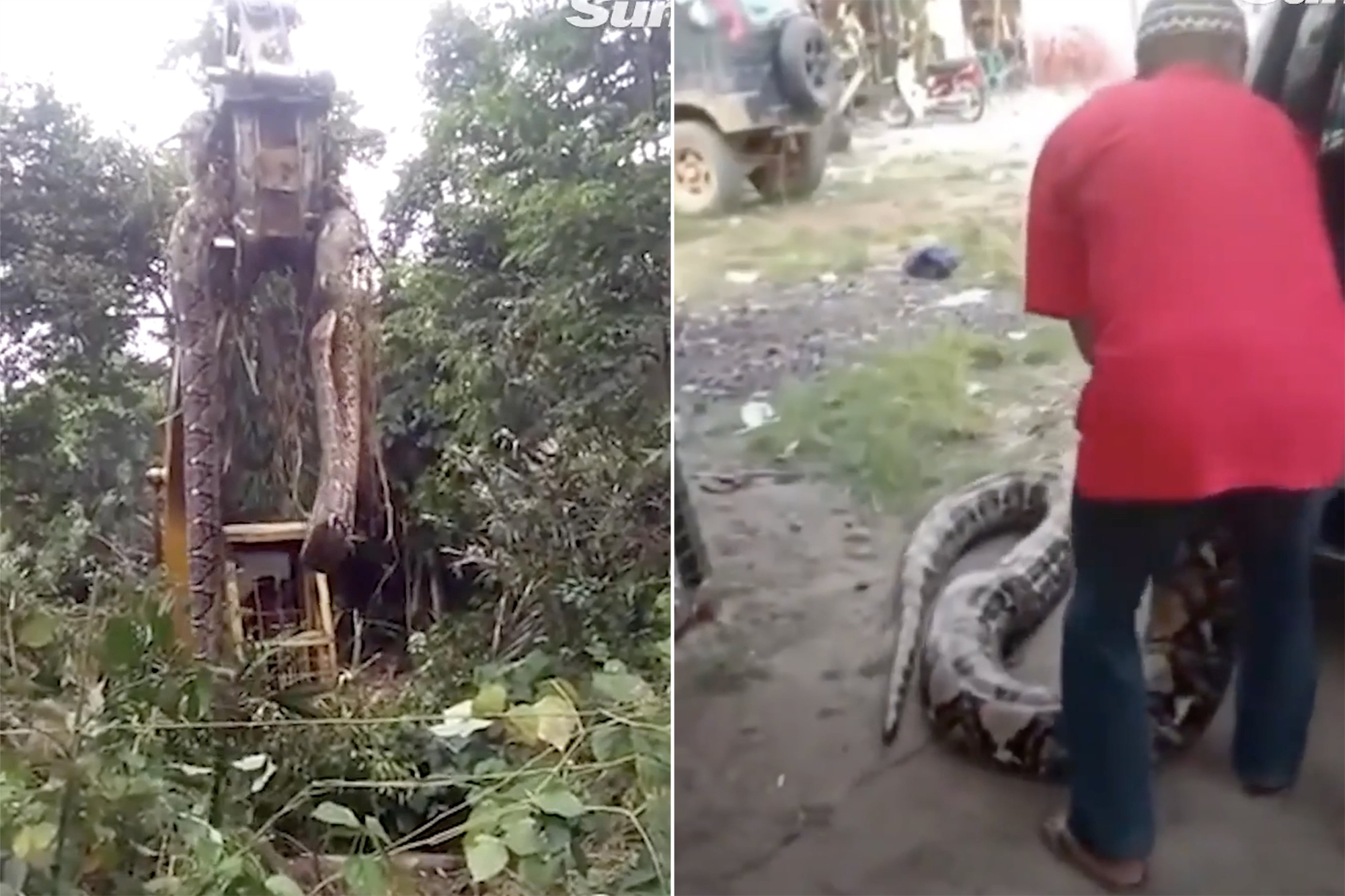 The snake, which is at least 10-feet long, is alive as it’s lifted by the digger.