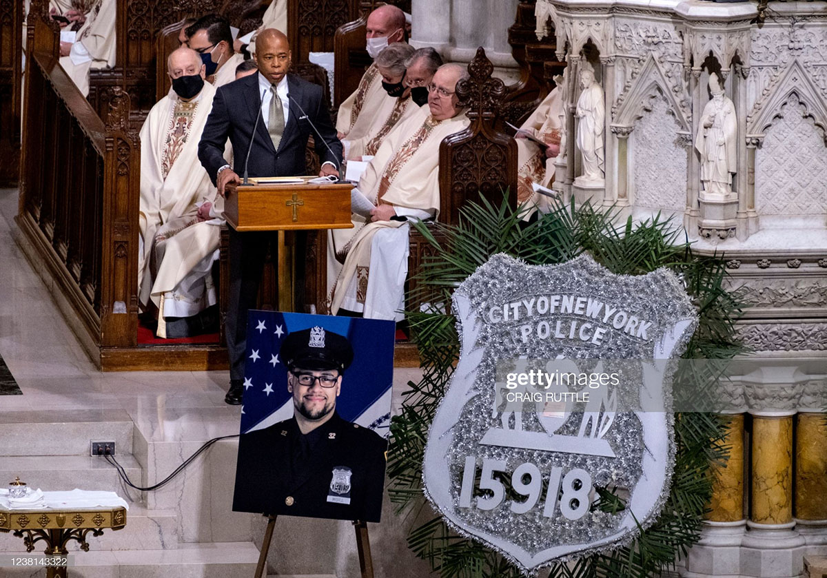 News Americas, NEW YORK, NY, Feb. 3, 2022: Murdered Caribbean immigrant New York City Police Officer, Wilbert Mora, was funeralized yesterday after a huge moving funeral service as St. Patrick’s Cathedral.