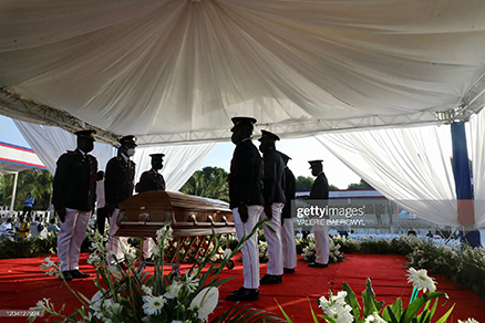 The pallbearers placed the polished casket on a dais garlanded with flowers. A Roman Catholic priest blessed the coffin and a Haitian flag was unfurled.