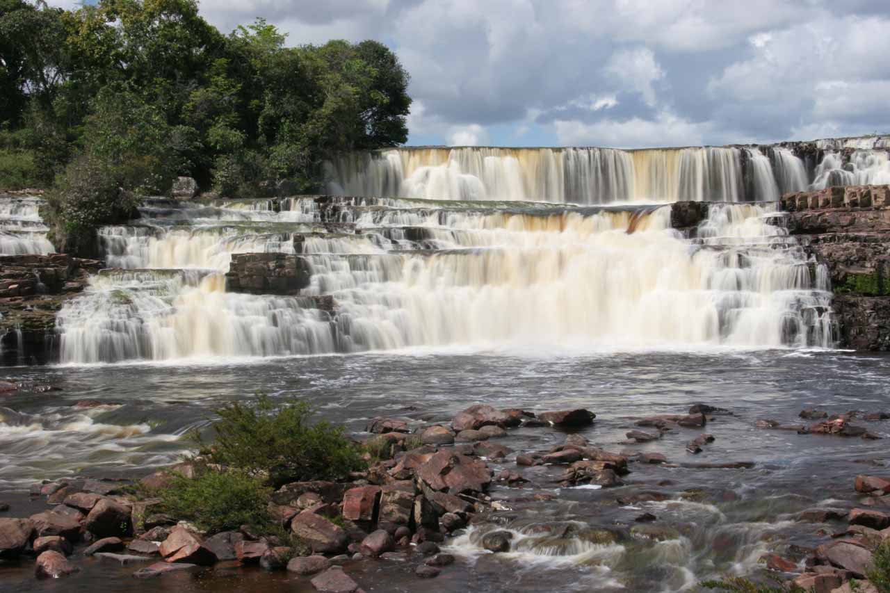 The falls are situated amid the rolling, grass-covered hills of the Pakaraima Mountains and is a wide, multi-tiered series of cascades that is approximately 25 m tall and more than 150 m wide.