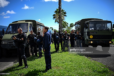 Gendarmes secure an area during a protest march against measures to limit the spread of Covid-19 in Les Abymes, outside Pointe-a-Pitre, on the French Caribbean island of Guadeloupe, on November 24, 2021. (Photo by CHRISTOPHE ARCHAMBAULT/AFP via Getty Images)