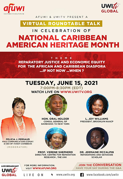 News Americas, NEW YORK, NY, Weds. June 8, 2021: The American Foundation of the University of the West Indies and UWI TV puts the spotlight on the hot button issue ofreparatory justice and economic equity this Caribbean American Heritage Month.