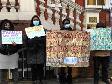 News Americas, LONDON, England, Weds. Nov. 10, 2021: A UK deportation flight that was set to fly to Jamaica with some 50 deportees today went without most of its passengers as activists blocked the road in front of a detention center and lawyers obtained short term stays.