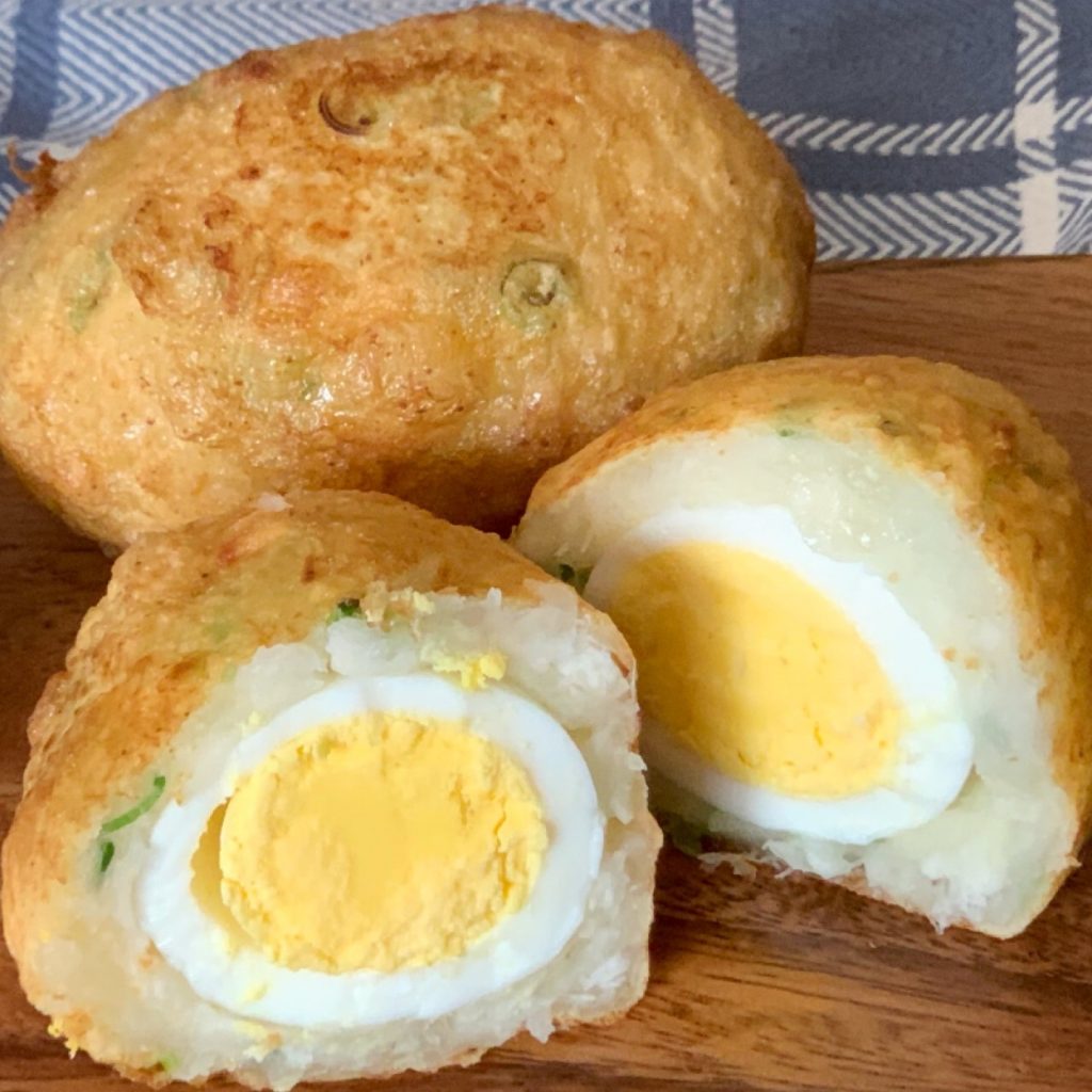 Add a hardboiled egg to the center of the cassava disk then cover the egg completely with the cassava