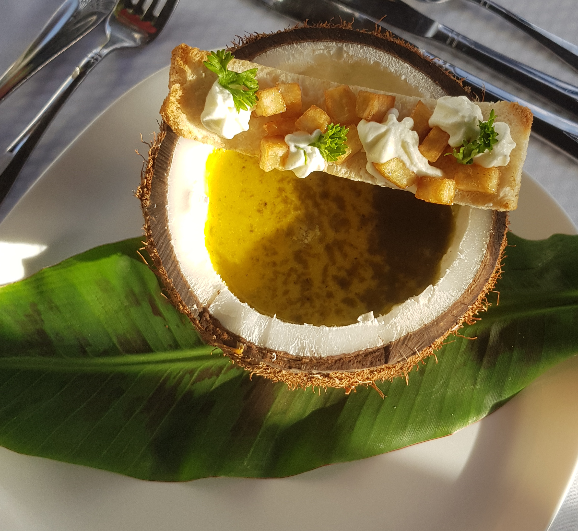 Pour soups into two separate bowls with a pouring spout. Then, pour two soups simultaneously into a coconut bowl. Garnish with wafer thin bread topped with croutons and coconut piped cream.