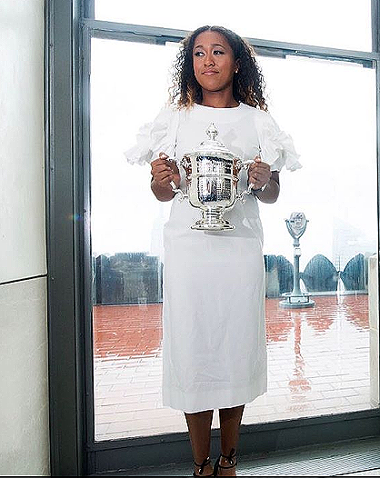 News Americas, NEW YORK, NY, Tues. Sept. 11, 2018: The tears are gone along with the black visor used to hide her face at the US Open trophy ceremony on Saturday, Sept. 8, 2018. Instead, the new US Open 2018 women’s champ, Caribbean roots Naomi Osaka, is all glammed up and finally smiling.