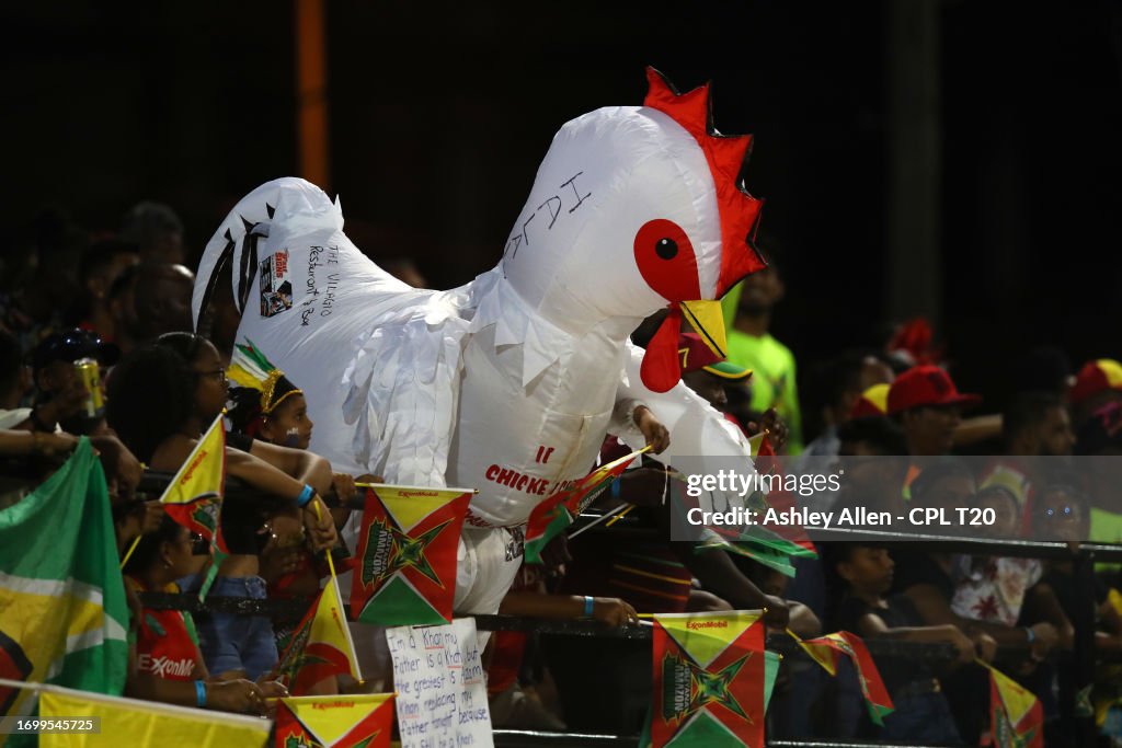 A fan dressed as a chicken shows his support during the Republic Bank Caribbean Premier League Final between Trinbago Knight Riders and Guyana Amazon Warriors at Providence Stadium on September 24, 2023 in Guyana. (Photo by Ashley Allen – CPL T20/CPL T20 via Getty Images)