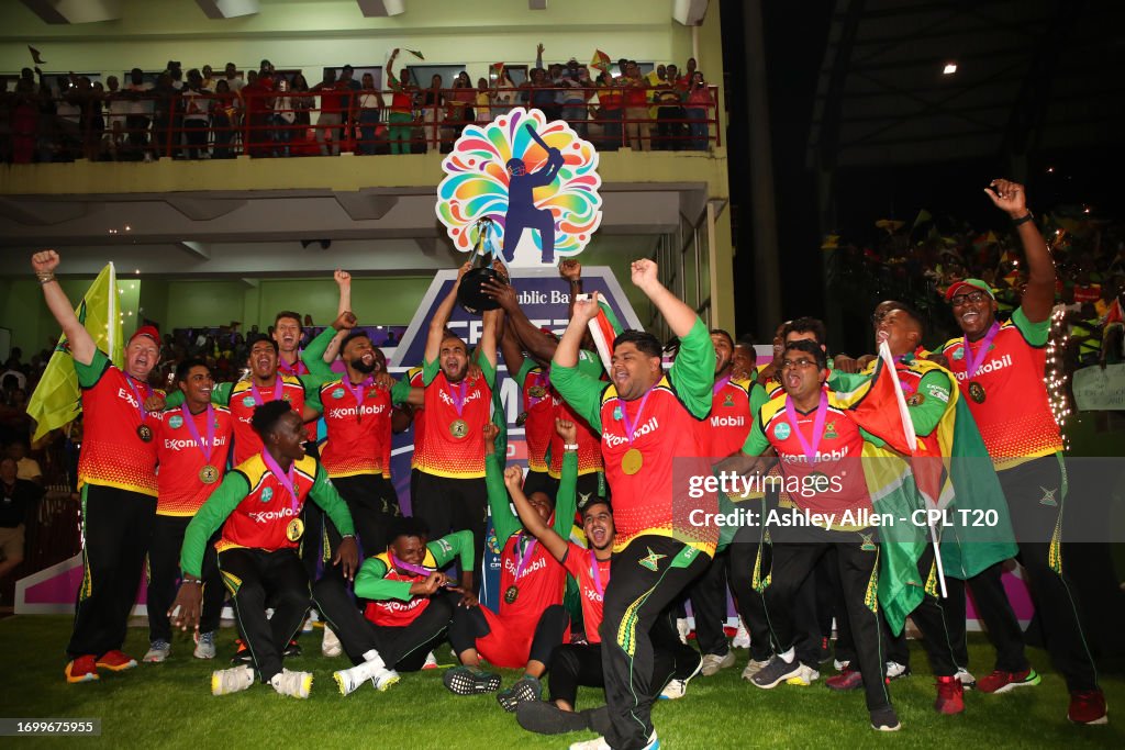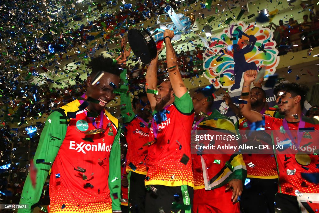 Odean Smith of Guyana Amazon Warriors lifts the Republic Bank Caribbean Premier League Trophy during the Republic Bank Caribbean Premier League Final between Trinbago Knight Riders and Guyana Amazon Warriors at Providence Stadium on September 24, 2023 in Guyana. (Photo by Ashley Allen – CPL T20/CPL T20 via Getty Images)Guyana Amazon Warriors players celebrate victory during the Republic Bank Caribbean Premier League Final between Trinbago Knight Riders and Guyana Amazon Warriors at Providence Stadium on September 24, 2023 in Guyana. (Photo by Ashley Allen – CPL T20/CPL T20 via Getty Images)Fans of Guyana Amazon Warriors cheer during the Republic Bank Caribbean Premier League Final between Trinbago Knight Riders and Guyana Amazon Warriors at Providence Stadium on September 24, 2023 in Guyana. (Photo by Ashley Allen – CPL T20/CPL T20 via Getty Images) Imran Tahir, captain of Guyana Amazon Warriors lifts the Republic Bank Caribbean Premier League Trophy after winning the Republic Bank Caribbean Premier League Final between Trinbago Knight Riders and Guyana Amazon Warriors at Providence Stadium on September 24, 2023 in Guyana. (Photo by Ashley Allen – CPL T20/CPL T20 via Getty Images)
